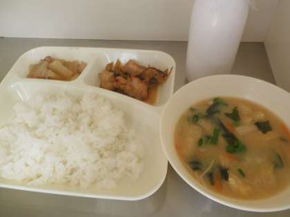 14日 鶏肉の甘辛焼き みそ汁 大根の煮物 ごはん 牛乳