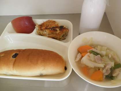 15日 鶏肉とじゃがいものスープ煮 きのこのドリア りんご
