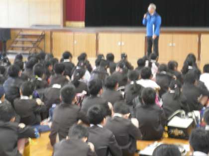 学級ごとに講堂へ避難して、校長先生のお話を聞きました。
