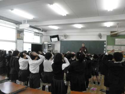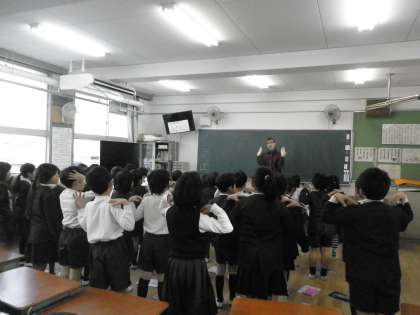 体の部分(頭・肩・耳・鼻・口など)を英語で言います。「Head!」「Shoulder!」など、子どもたちはよく知っています。
