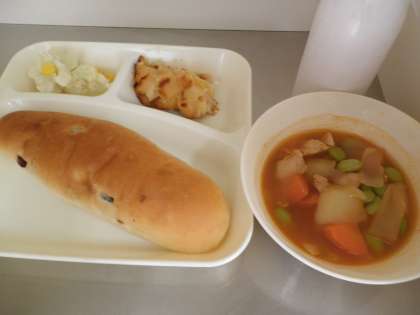 12日 鶏肉と野菜のケチャップ煮 カリフラワーとコーンのサラダ 桃のクラフティ レーズンパン 牛乳