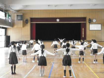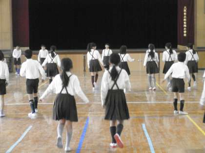 運動委員会の児童が前に出て、「WAになっておどろう」の曲に合わせて、軽快に踊っています。(写真は4年生)