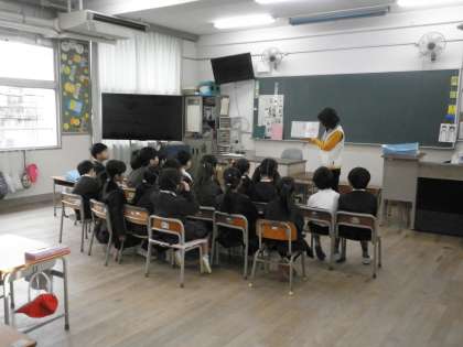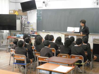 毎週火曜日の朝は、「おはなしスマイル」の皆さんが絵本の読み聞かせをしてくださいます。1月23日は、1年1組と2組、3年と5年の順番でした。