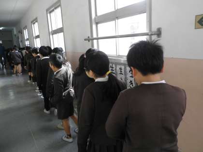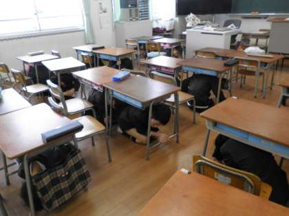 防災学習のあと、避難訓練をしました。地震が起きた時には机の下に避難し、その後、津波に備えて校舎3階廊下に避難する訓練をしました。