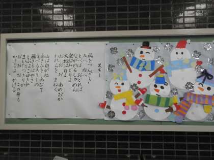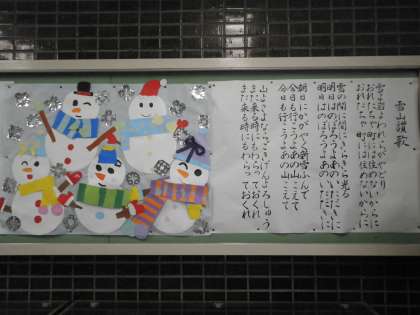 冬の歌は、「スキー」「雪山讃歌」の歌詞を校長先生が書いてくださいました。先日、来校された地域の方が、「懐かしい歌ですね。」と口ずさんでおられたそうです。