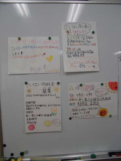 今日が最後の栽培活動です。来年度、今年よりもさらに多くの人に入ってもらうために募集のポスターを作成しました。たくさんの人が入ってもらえるように願いながらていねいに作っていました。最後に、四年生や五年生を引っ張っていってくれた六年生にみんなからありがとうの言葉をかけて終わりました。地域の皆様、苗の植え方や子どもたちに色々な話をしていただくなどご協力ありがとうございました。