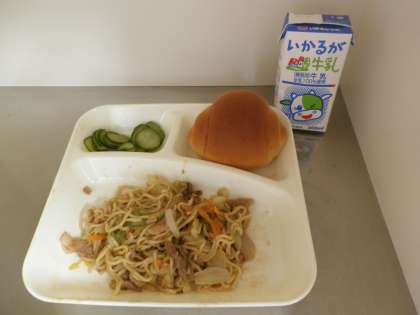 献立は、焼きそば、きゅうりのしょうがづけ、黒糖クレセントロールパン、牛乳でした。