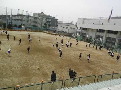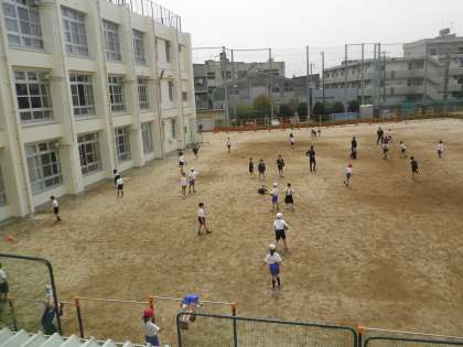 子どもたちが元気に遊んでいます。新しくなった鉄棒で前回りをしたり、友だちとボールを投げ合ったり・・・講堂の屋上からは、地域の方からお借りした大きなこいのぼりが子どもたちを見守ります。