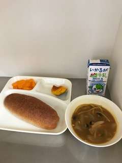 献立は、カレースープスパゲッティ 焼きかぼちゃ みかん(缶) ライ麦パン 牛乳でした。
