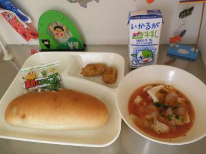 献立は、ひとくちトンカツ、ミネストローネ、まめこんぶ、レーズンパン、牛乳です。