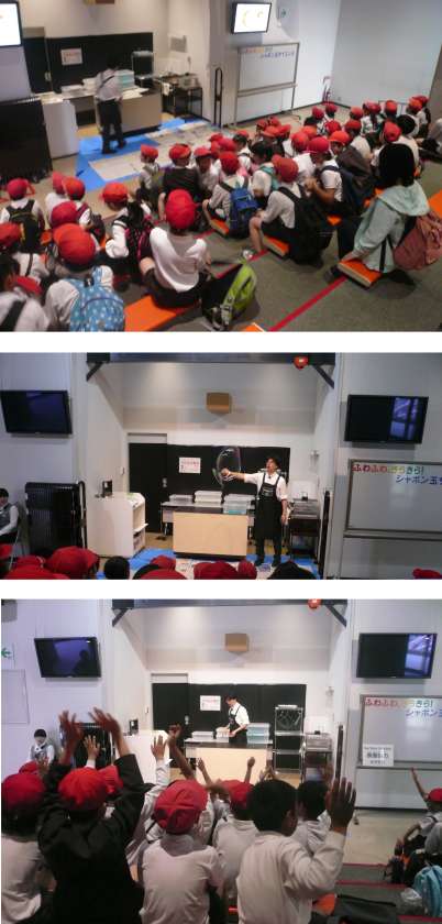 初めにサイエンスショー 「シャボン玉のヒミツ」の実験でした。