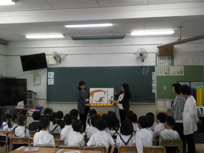 職員室での自己紹介の後、初日の今日は1年生の教室で大型絵本を読んでくださいました。