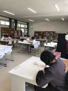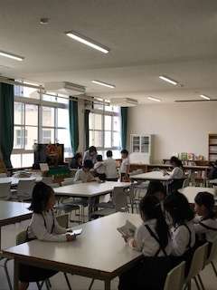 お昼休み、図書館支援員の辻先生と一緒に、図書委員の児童が図書館開放をしています。本の修繕もします。