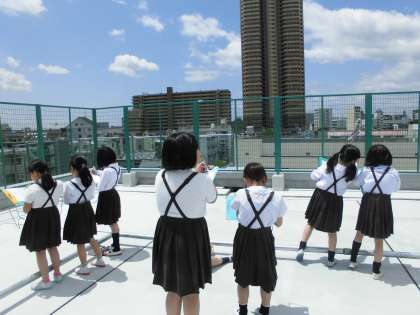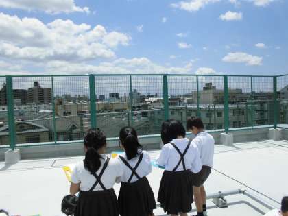 今日は社会科の学習で新校舎の屋上に上がり、わたしたちが住んでいる町の様子を見学しました。