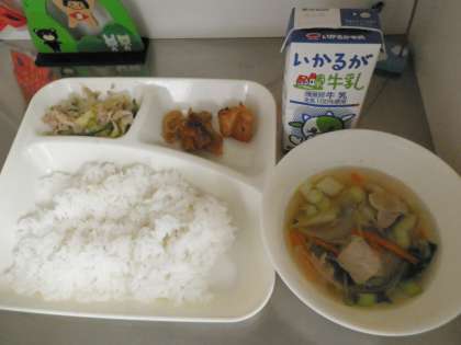 献立は、鶏肉のオイスターソース焼き 中華スープ ツナと野菜のごま炒め ごはん 牛乳でした。