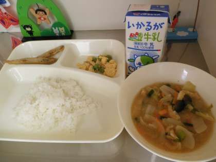献立は、きびなごてんぷら みそ汁 えんどうのたまごとじ ごはん 牛乳でした。