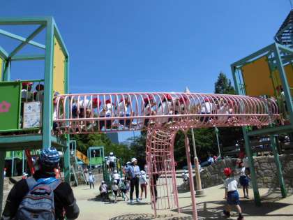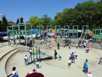 大阪城公園では、はじめに大きな遊具広場で遊びました。近くの公園にはない遊具に、子どもたちは大喜びしていました。