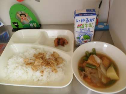 献立は、鶏肉の照り焼き じゃがいもと厚揚げの煮物 ごまかかいため ごはん 牛乳でした。
