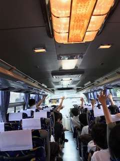 上野ドライブインを出て、子ども達はバスレクをして盛り上がっています。道路はすいていて、順調です。