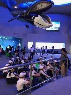 集合して平田先生の話を聞いています。 これから大阪へ向けてバスに乗ります。