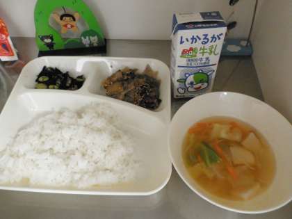 献立は、豚肉のごまだれ焼き ごもく汁 ひじきの炒め煮 ごはん 牛乳でした。