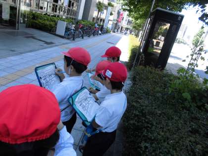 社会科「町たんけんと絵地図づくり」の学習で、南市岡小学校の校区周辺の町たんけんに行きました。子どもたちは3グループに分かれ、各地域の土地利用の様子について調べました。活動のなかで知らなかったお店や工場、昔の線路跡を発見することができました。