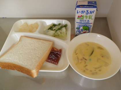 献立は、かぼちゃのクリームシチュー キャベツと三度豆のサラダ 和なし(缶) 食パン いちごジャム 牛乳 でした。