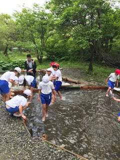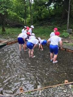 友だちのために、みんなで魚を追い込んで捕まえます。