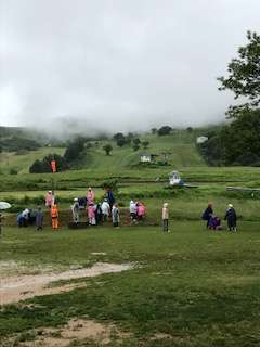 材料を混ぜて容器にセットします。広場の小山の坂を利用して転がします。