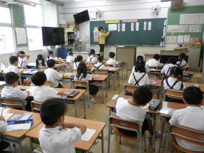 (写真は2時間目、1年1組です。3時間目には1年2組が同じ学習をしました。)