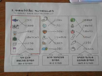 1年生は初めての栄養指導です。城先生から「たべもののなまえをしろう」という主題で教えていただきました。