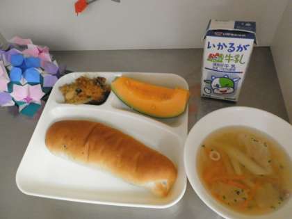 7日 カレードリア スープ クインシーメロン レーズンパン 牛乳
