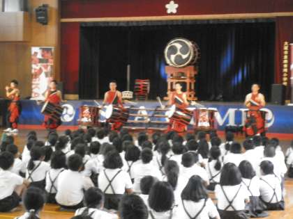 今年度は、和太鼓集団「舞太鼓あすか組」に来ていただき、本物の和太鼓の演奏を楽しみました。