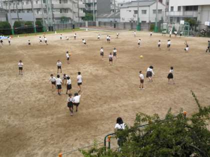 休み時間、広い運動場で元気に遊んでいる児童が大勢います。