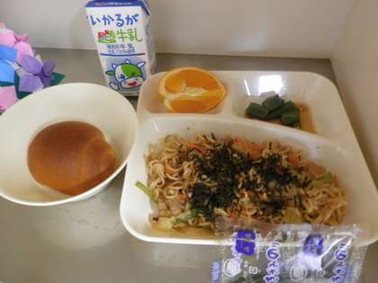献立は、焼きそば オクラの中華和え オレンジ 黒糖クレセントロールパン 牛乳でした。
