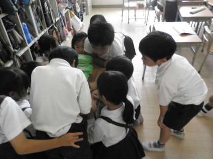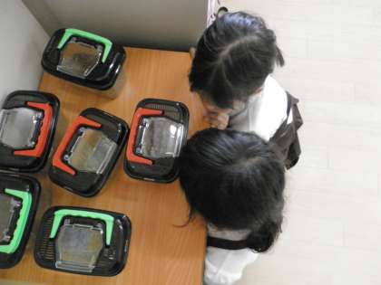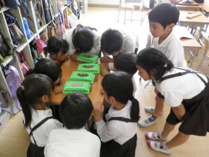 子どもたちはクワガタの飼育箱をのぞきながら、