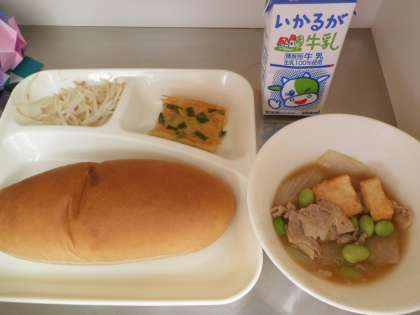 献立は、豚肉と野菜の煮物 チヂミ もやしの甘酢あえ 黒糖パン 牛乳でした。