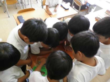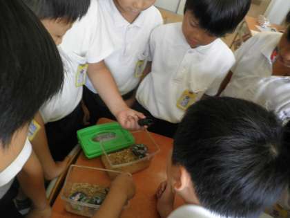 3年生が国語科「調べて書こう・わたしのレポート」の学習をしていました。前に集まっていたグループは、理科で観察しているクワガタムシを触って、わかったことを作文に書くそうです。