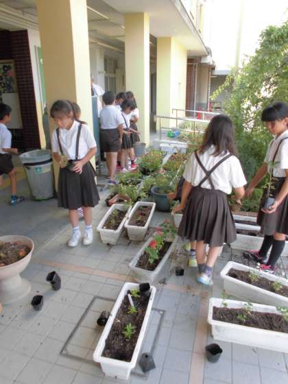 自分の当番を忘れないためにはどのようにするかもみんなで考えました。最後に苗をみんなで植え替え、水やりをしました。