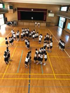 講堂では1年生と6年生が、音楽に合わせて、じゃんけん列車をしていました。