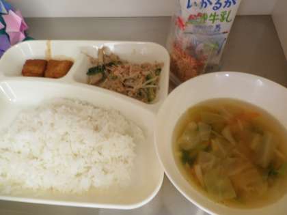 1学期最後の給食献立は、ゴーヤチャンプルー すまし汁 厚揚げの味噌だれかけ ごはん 牛乳 でした。