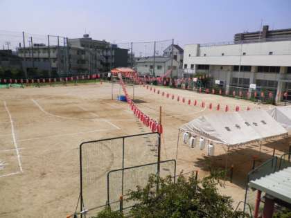 すき屋根ん夏まつりの準備がすっかりできています。暑さ指数も、12時から「危険」18時から「厳重警戒」です。熱中症に気を付けて水分補給をこまめにとりましょう。