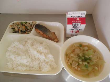 献立は、さけのしょうゆ風味焼き ごもく汁 高野どうふのいり煮 ごはん 牛乳でした。