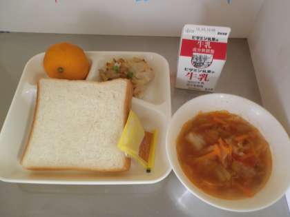 みかん(冷凍) 食パン アプリコットジャム 牛乳でした。