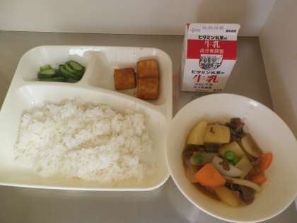 献立は、肉じゃが 厚揚げのみそだれかけ あっさりきゅうり ごはん 牛乳でした。