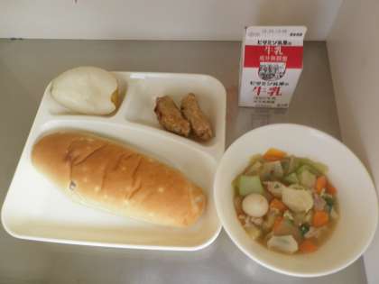 献立は、あげギョウザ 中華煮 梨(豊水) おさつパン 牛乳でした。