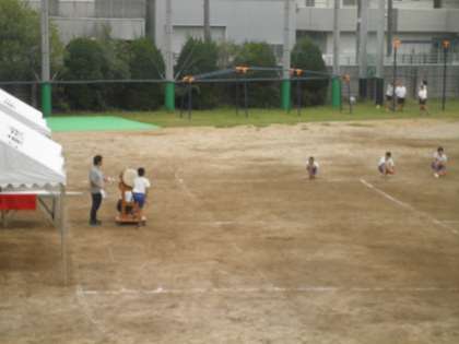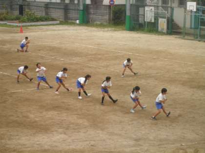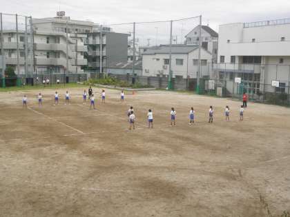 放課後の運動場で、応援団が練習をしていました。団長の掛け声に合わせて、手拍子もそろってきました。太鼓担当もタイミングよく打ち鳴らせるように練習しています。