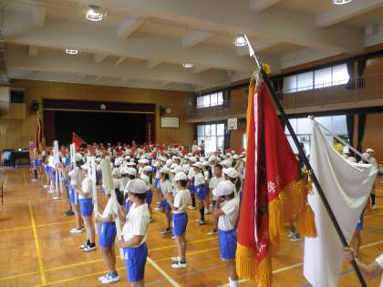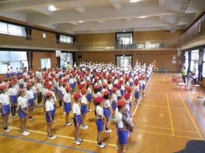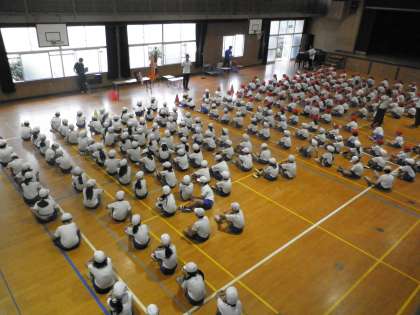 運動会に向けて、全体練習を行いました。雨で運動場が使えなかったので、講堂で開閉会式の練習をしました。