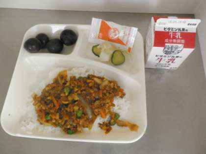 献立は、大豆入りキーマカレー(米粉) グリーンサラダ ノンエッグドレッシング ぶどう(巨峰) 牛乳でした。