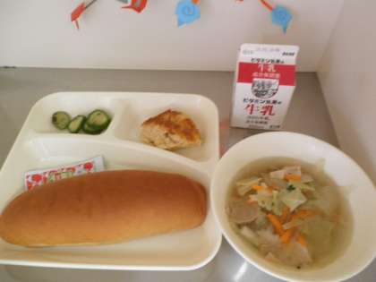 ツナポテトオムレツ スープ きゅうりのバジル風味サラダ